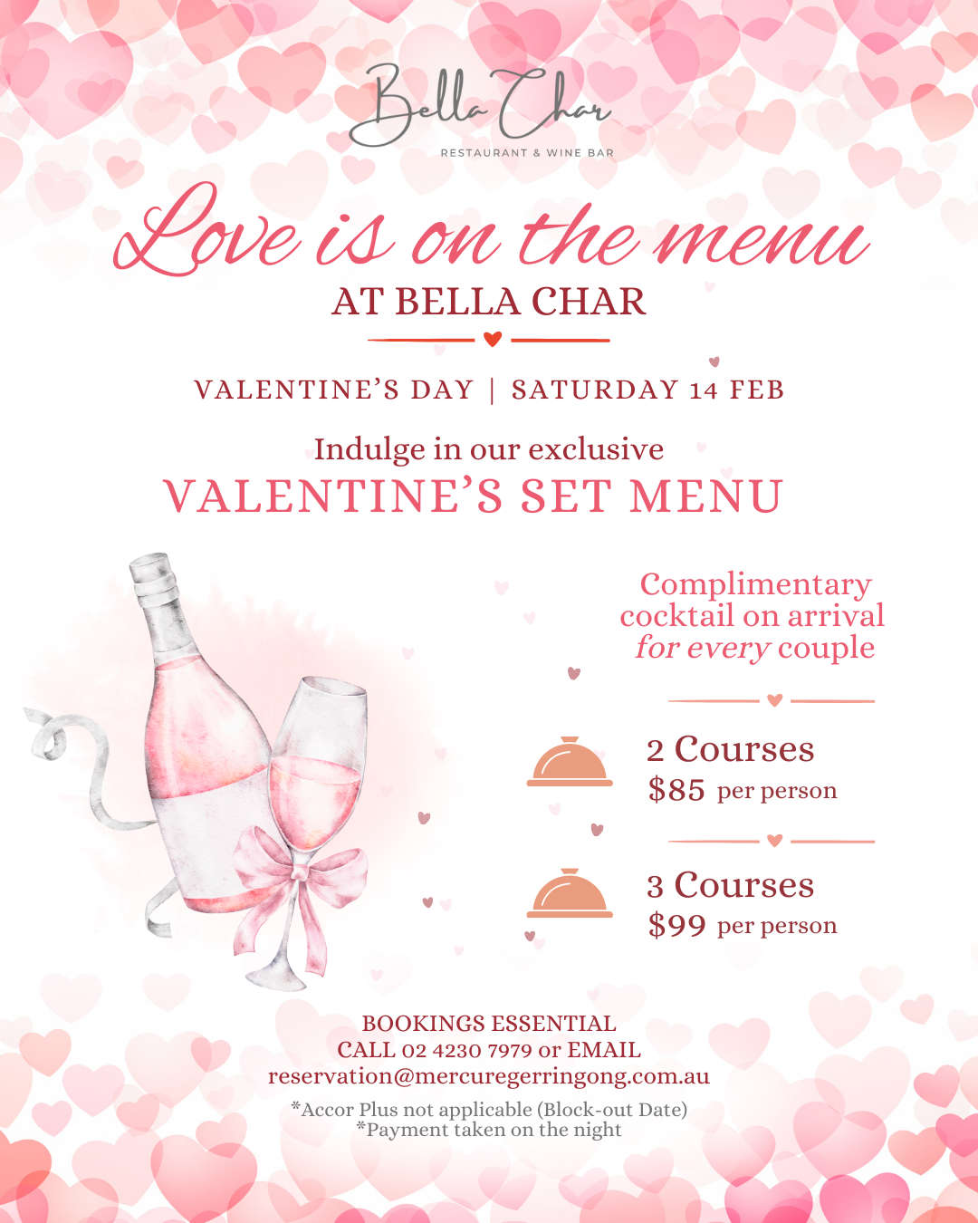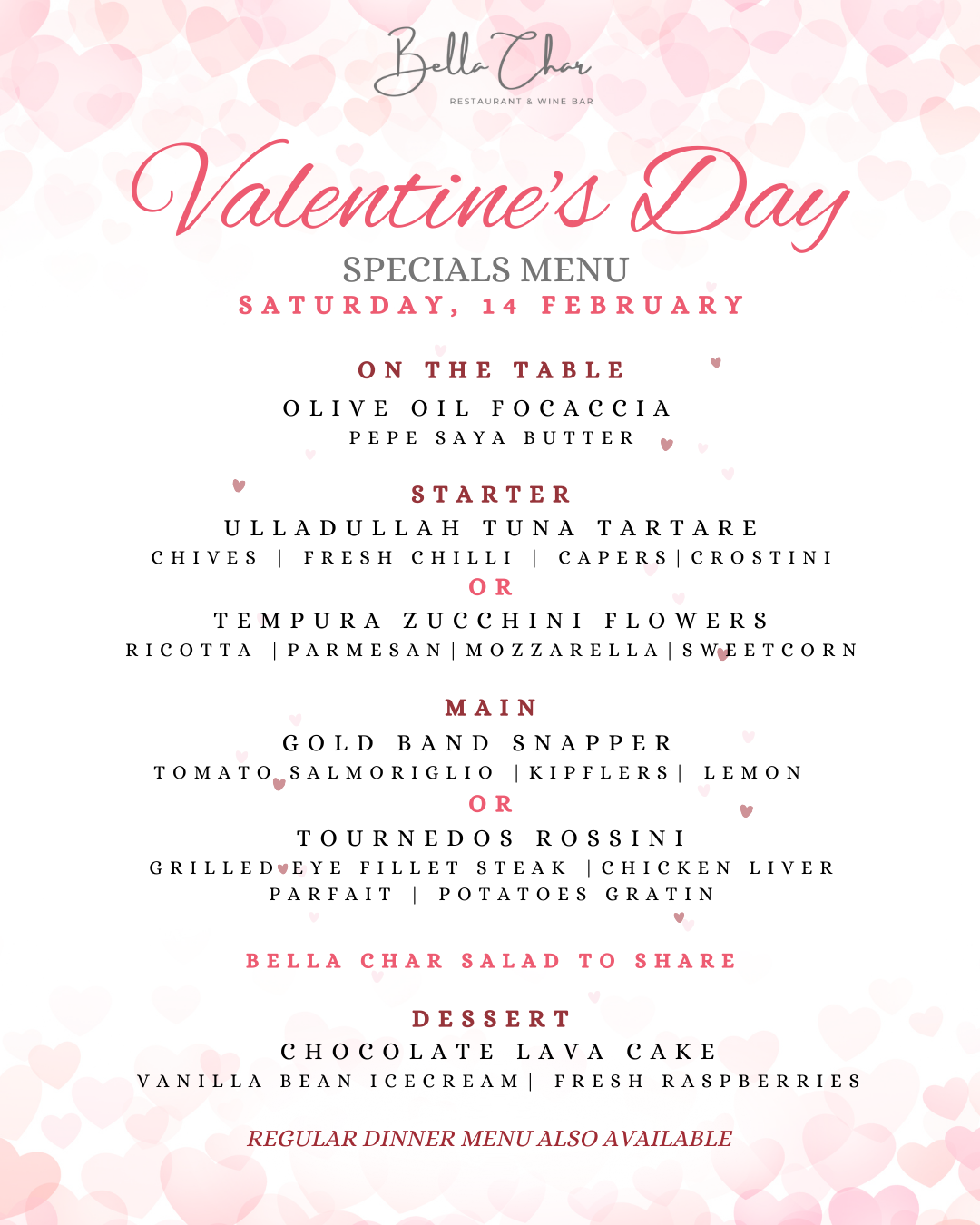 Celebrate love this Valentine’s Day with a memorable dining experience at Bella Char Restaurant & Wine Bar. Enjoy a specially crafted menu in a stylish, modern setting – perfect for a romantic evening.